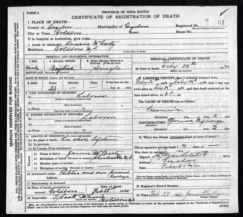 Death Registration: Year: 1920 file: 68 number: 64