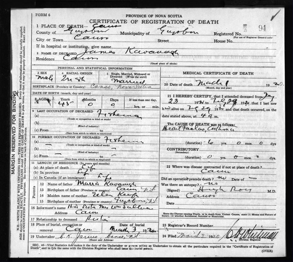 Death Registration: Year: 1920 file: 68 number: 94