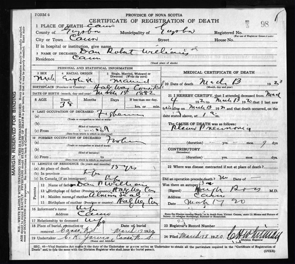 Death Registration: Year: 1920 file: 68 number: 98