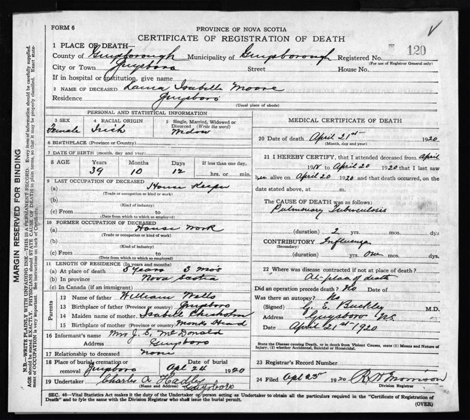 Death Registration: Year: 1920 file: 68 number: 120
