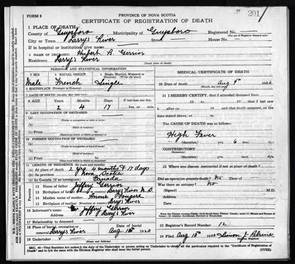 Death Registration: Year: 1920 file: 68 number: 201