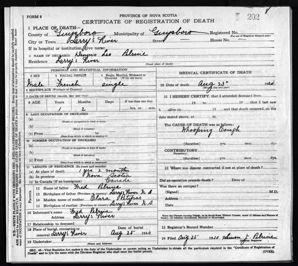 Death Registration: Year: 1920 file: 68 number: 202