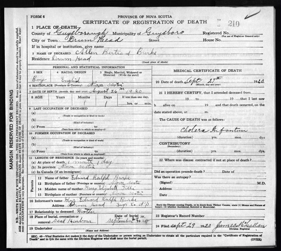 Death Registration: Year: 1920 file: 68 number: 210
