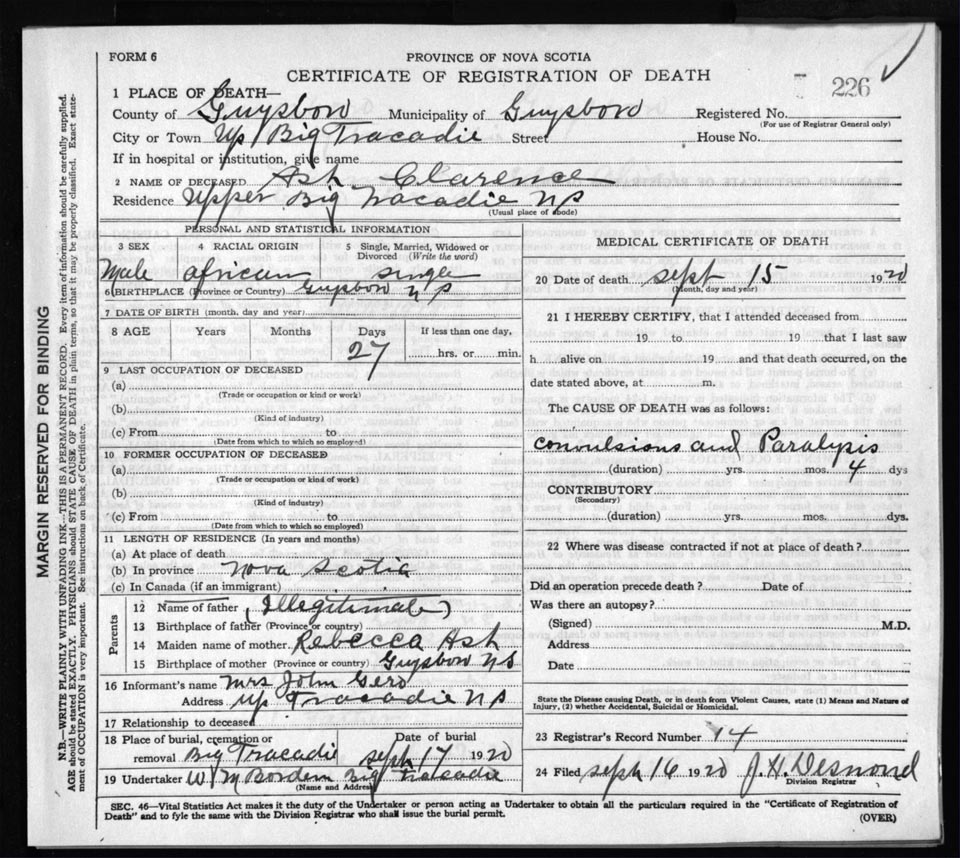 Death Registration: Year: 1920 file: 68 number: 226