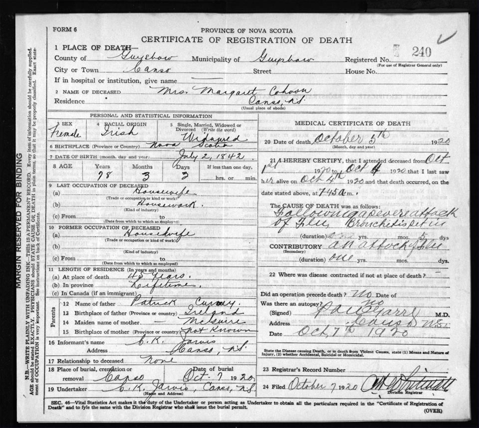 Death Registration: Year: 1920 file: 68 number: 240