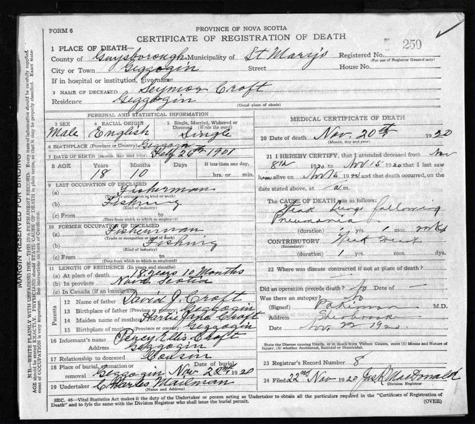 Death Registration: Year: 1920 file: 68 number: 250