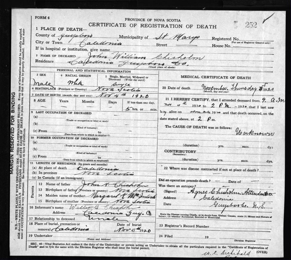 Death Registration: Year: 1920 file: 68 number: 252