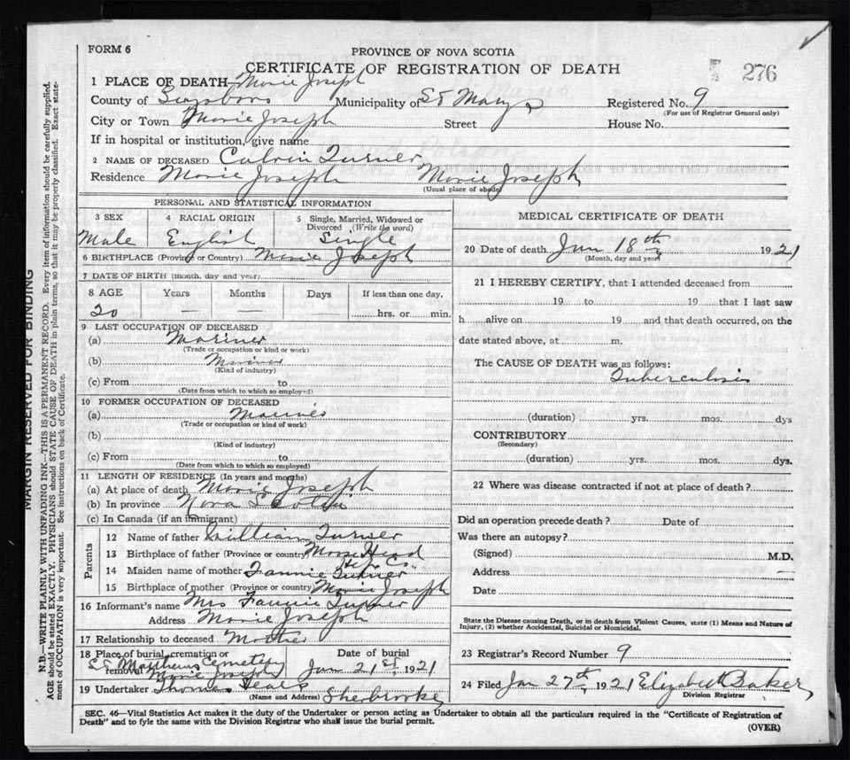Death Registration: Year: 1921 file: 68 number: 276