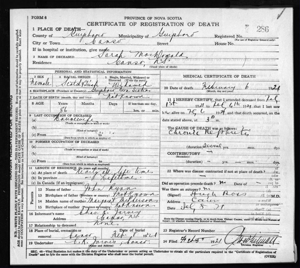 Death Registration: Year: 1921 file: 68 number: 286