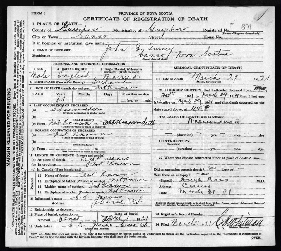 Death Registration: Year: 1921 file: 68 number: 301