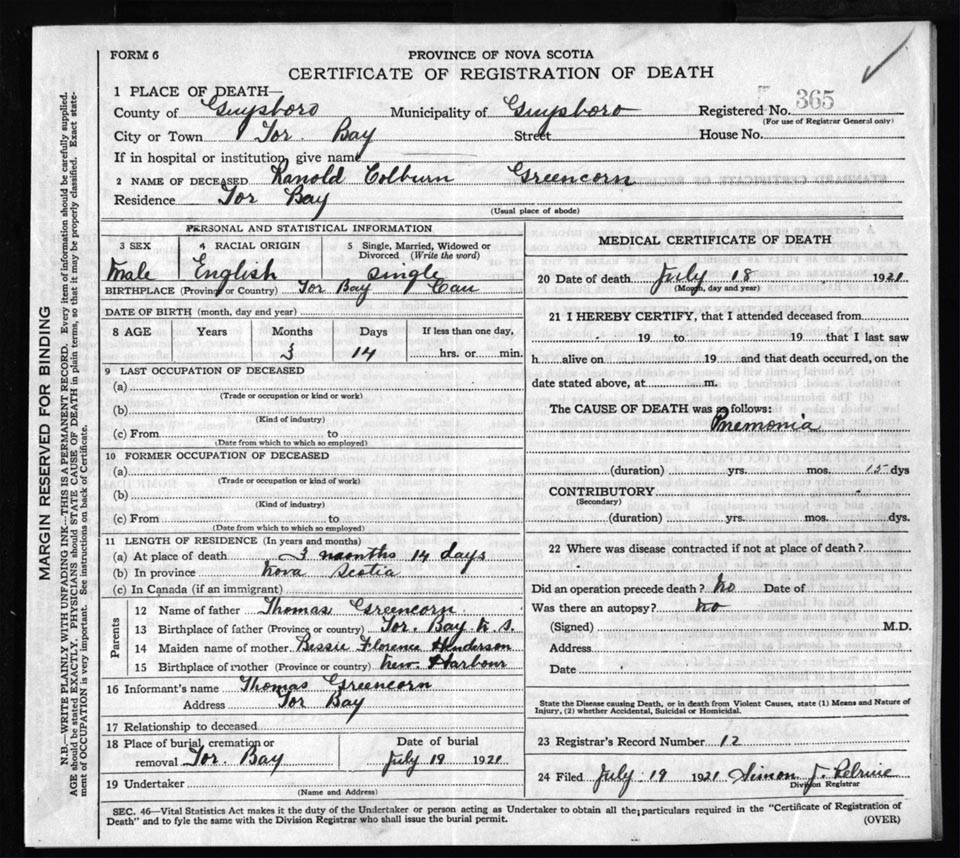 Death Registration: Year: 1921 file: 68 number: 365