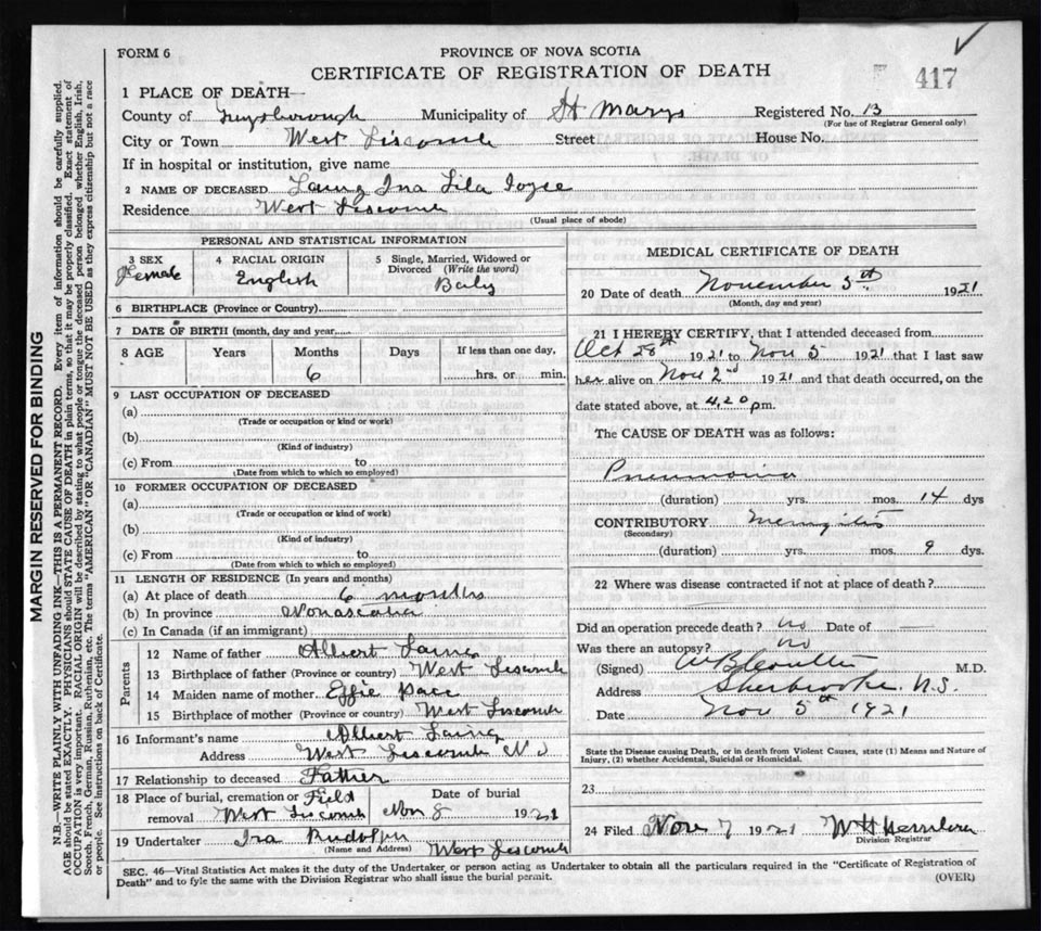 Death Registration: Year: 1921 file: 68 number: 417