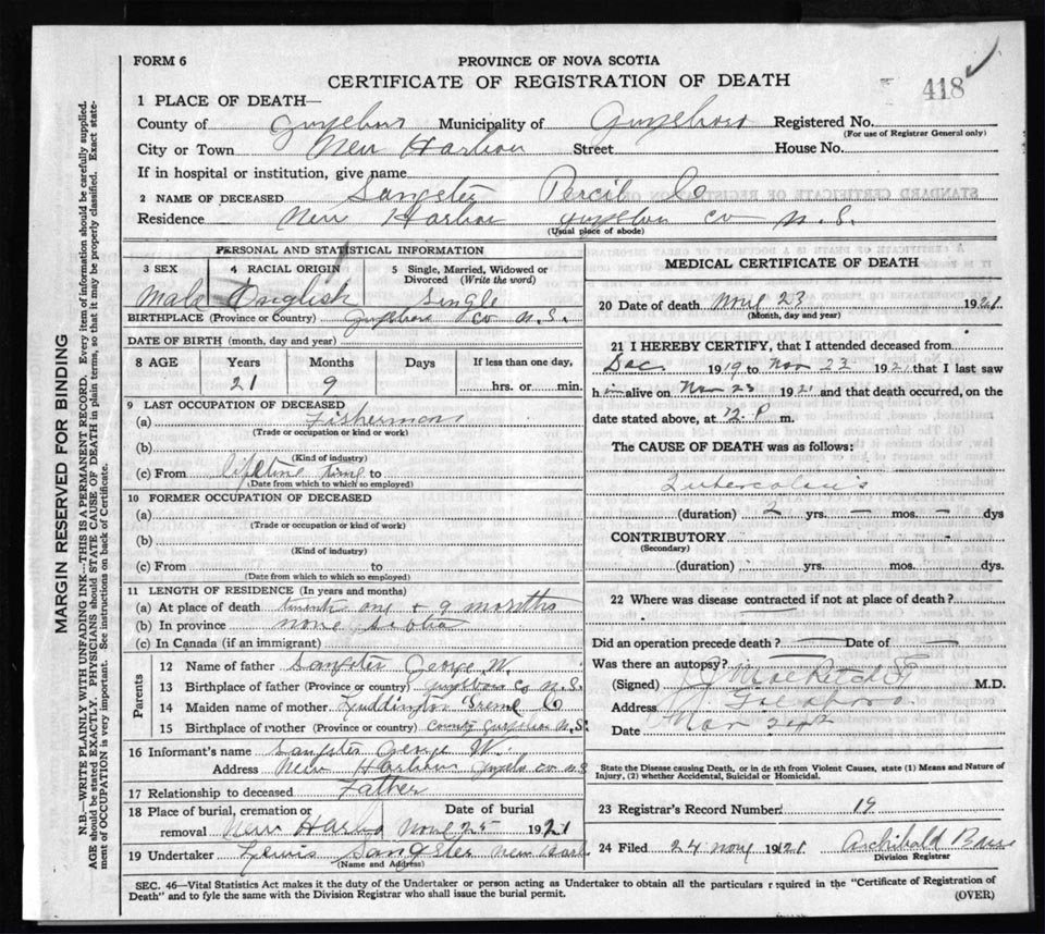 Death Registration: Year: 1921 file: 68 number: 418