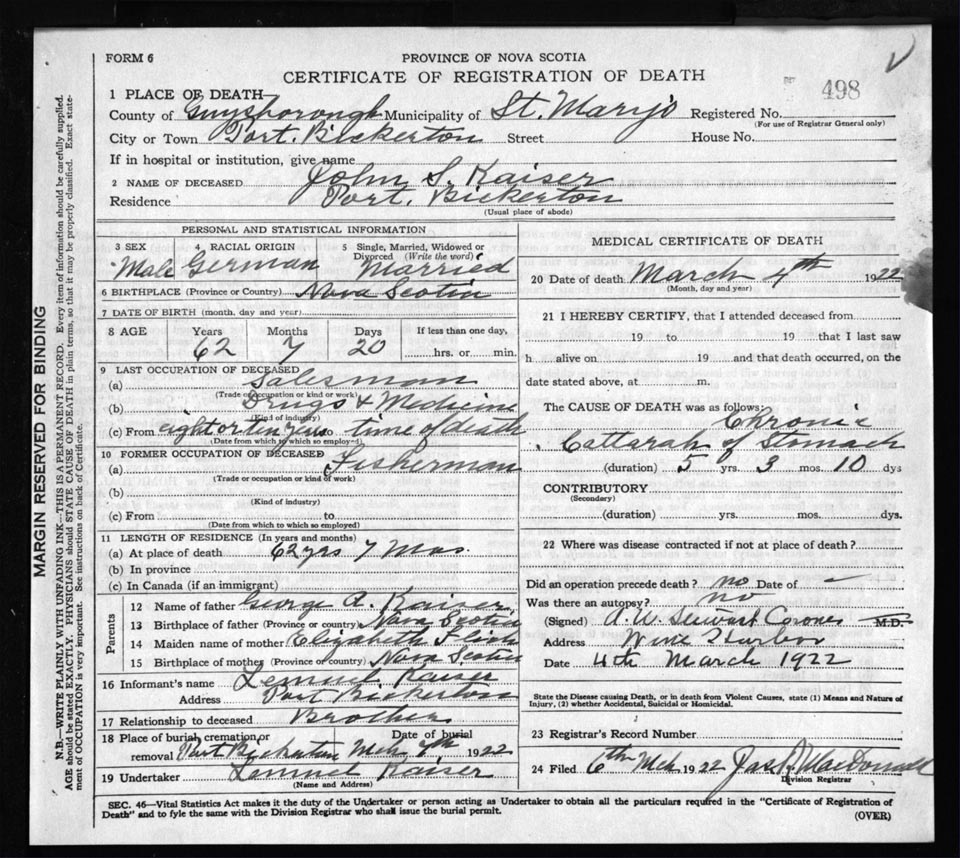 Death Registration: Year: 1922 file: 68 number: 498