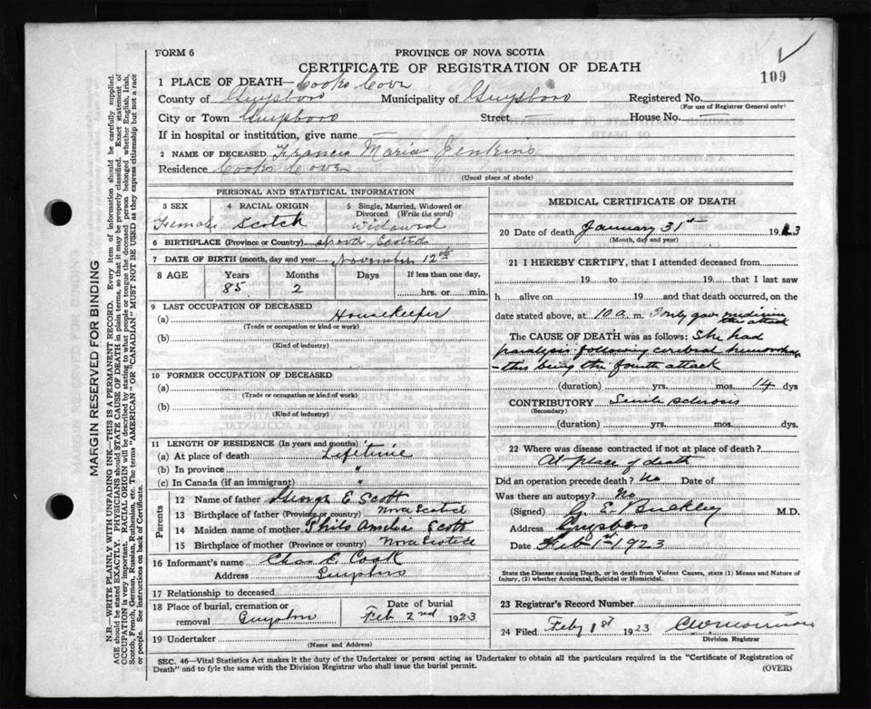 Death Registration: Year: 1923 file: 69 number: 109