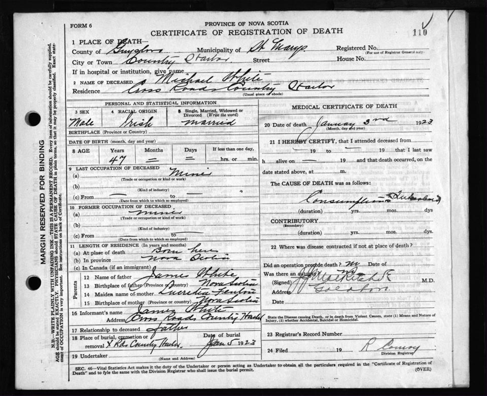 Death Registration: Year: 1923 file: 69 number: 110