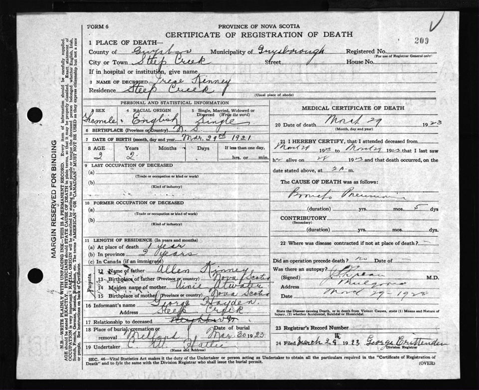 Death Registration: Year: 1923 file: 69 number: 209