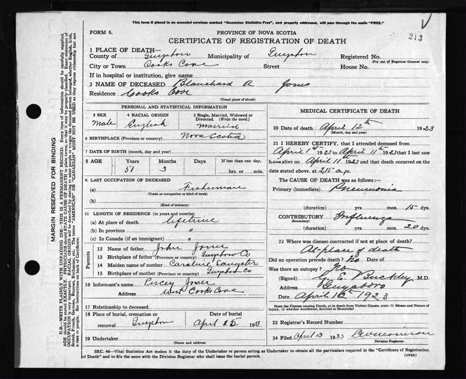 Death Registration: Year: 1923 file: 69 number: 213