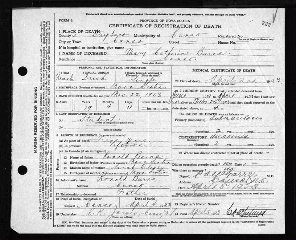 Death Registration: Year: 1923 file: 69 number: 222