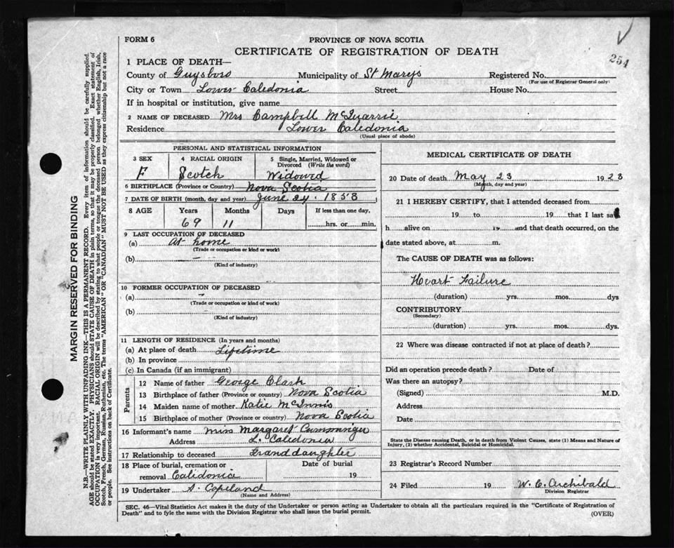 Death Registration: Year: 1923 file: 69 number: 254