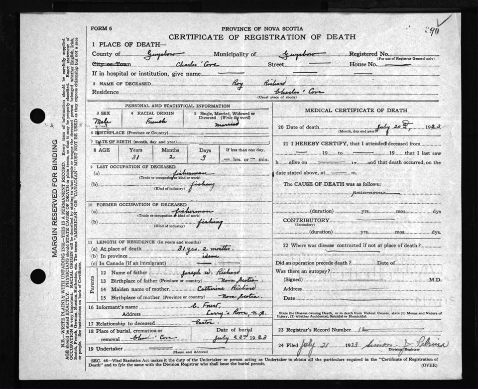 Death Registration: Year: 1923 file: 69 number: 290
