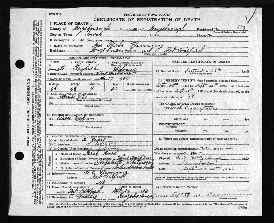 Death Registration: Year: 1923 file: 69 number: 313
