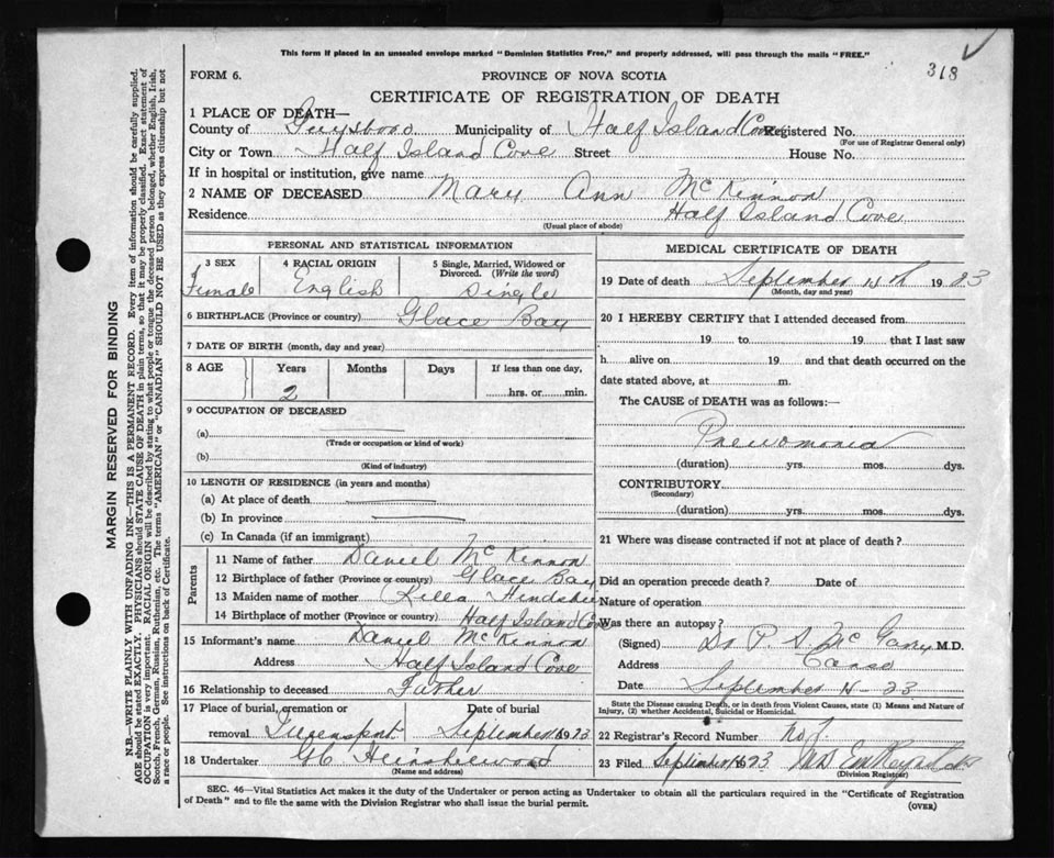 Death Registration: Year: 1923 file: 69 number: 318