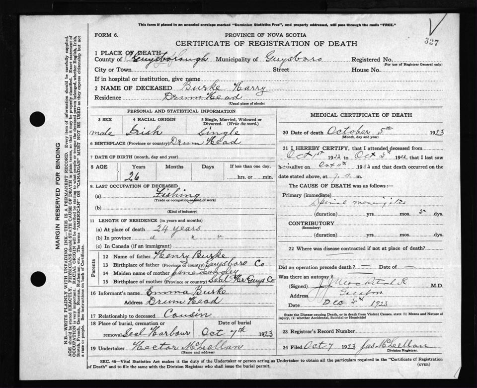Death Registration: Year: 1923 file: 69 number: 327