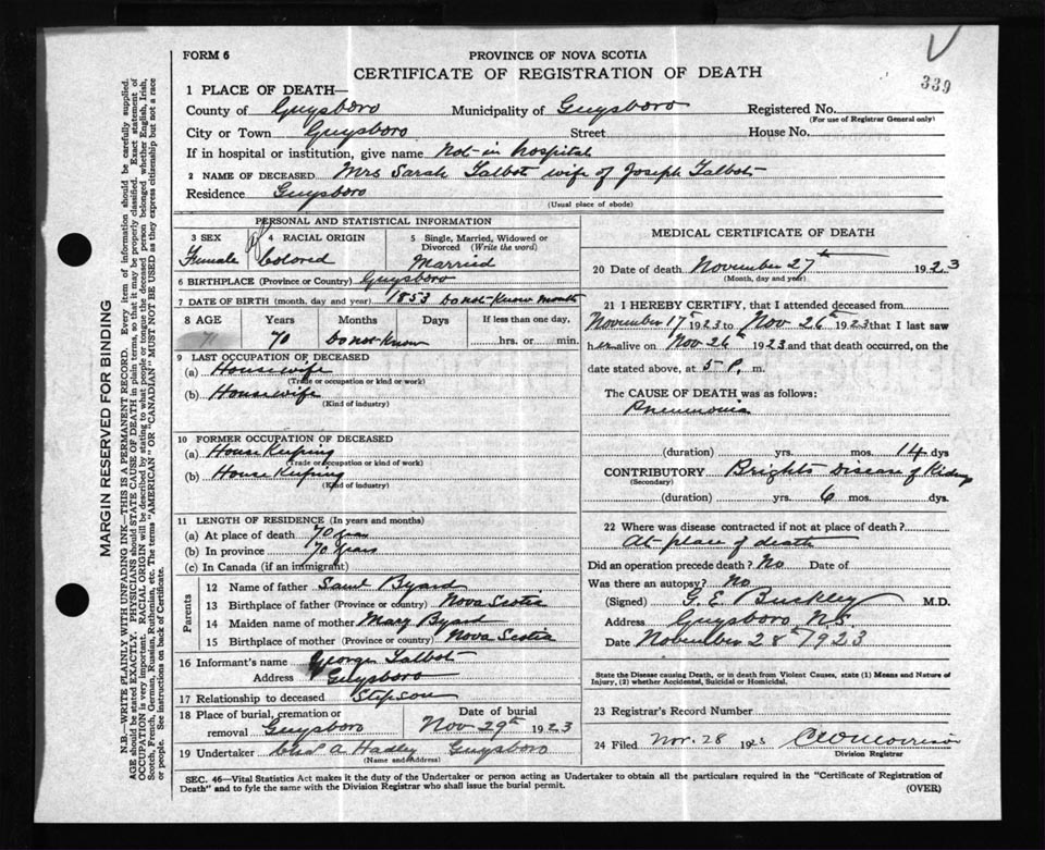 Death Registration: Year: 1923 file: 69 number: 339