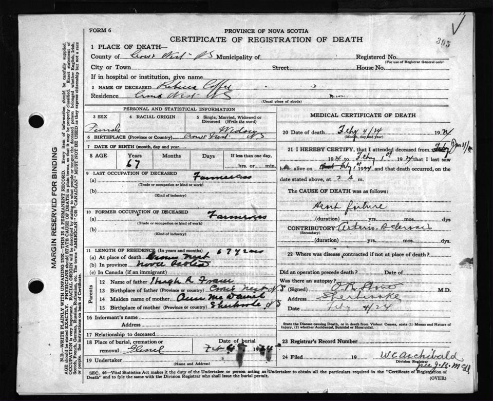 Death Registration: Year: 1924 file: 69 number: 395