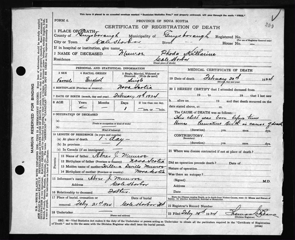 Death Registration: Year: 1924 file: 69 number: 399