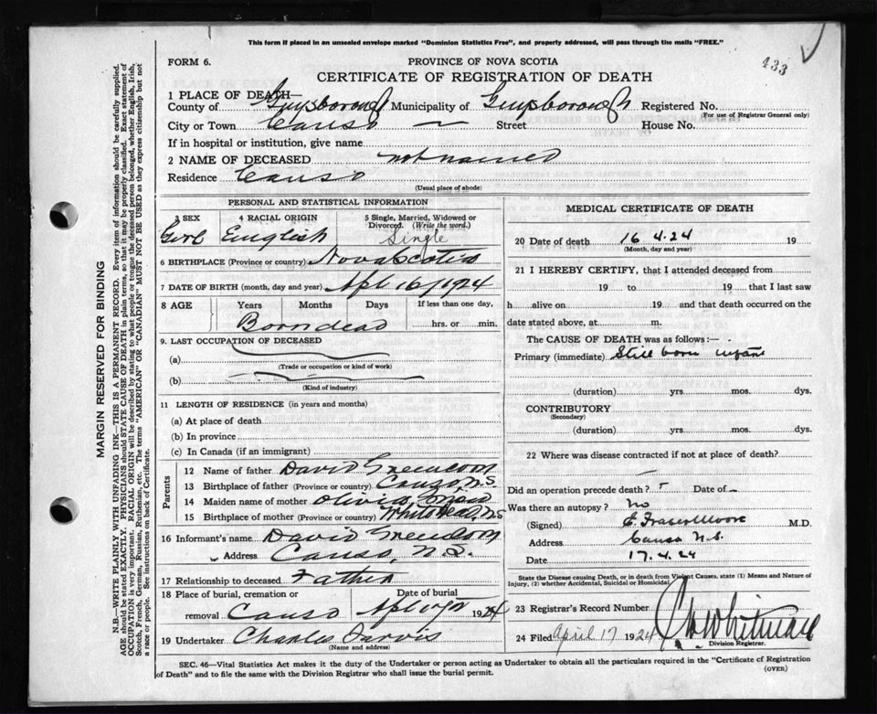 Female Death Registration: Year: 1924 file: 69 number: 433