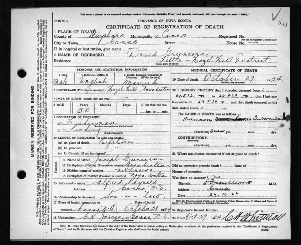 Death Registration: Year: 1924 file: 69 number: 533