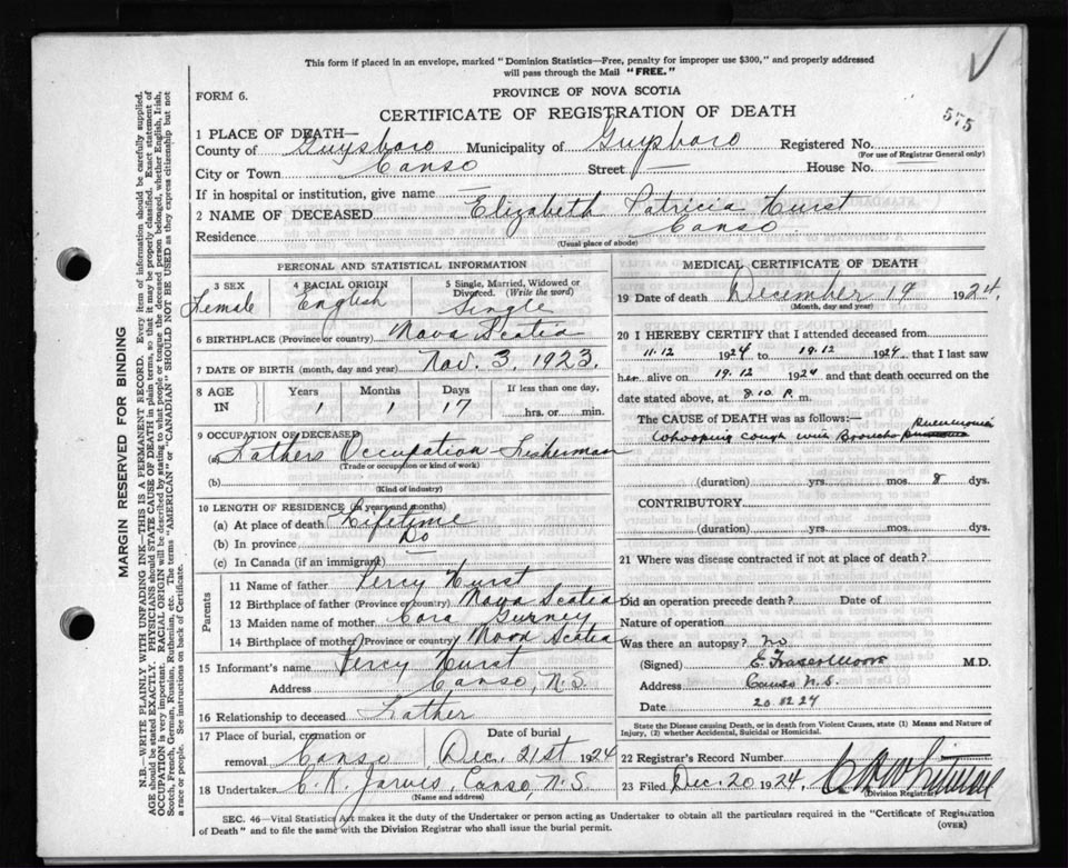 Death Registration: Year: 1924 file: 69 number: 575