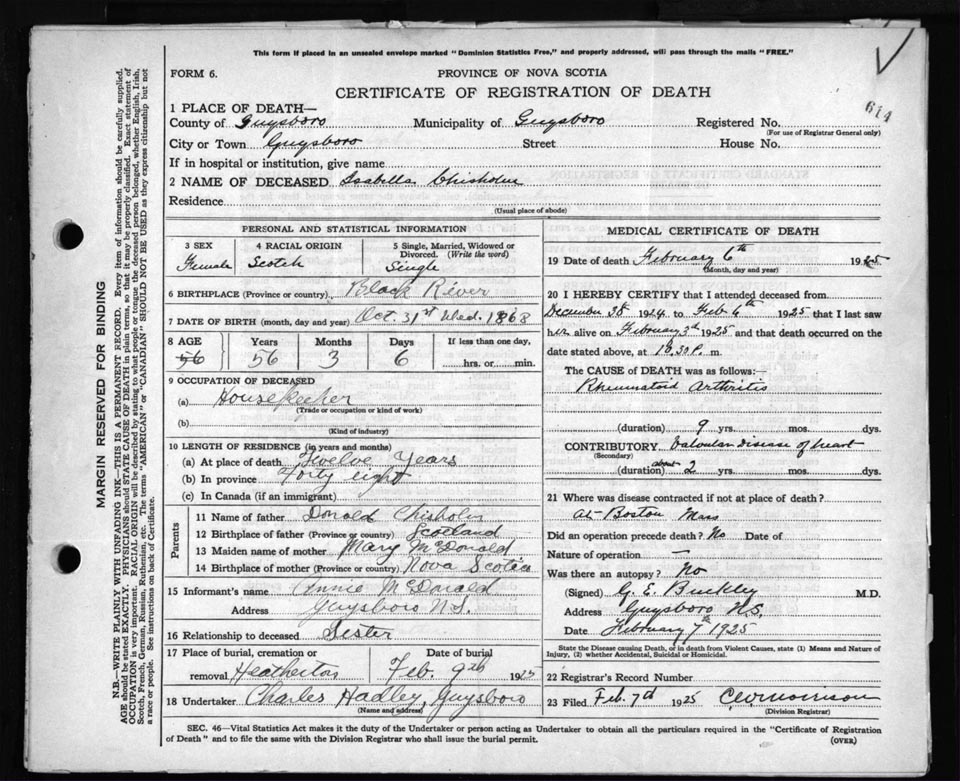 Death Registration: Year: 1925 file: 69 number: 614