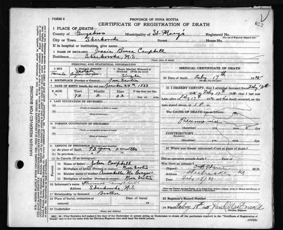 Death Registration: Year: 1925 file: 69 number: 622