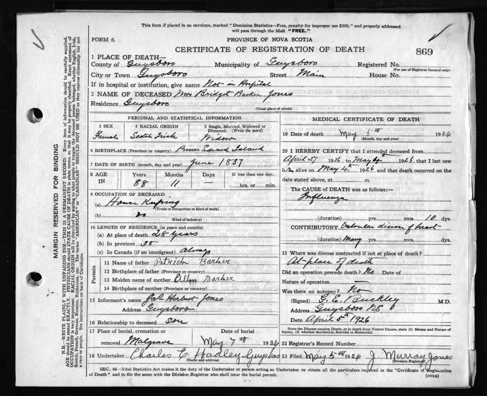 Female Death Registration: Year: 1926 file: 69 number: 869