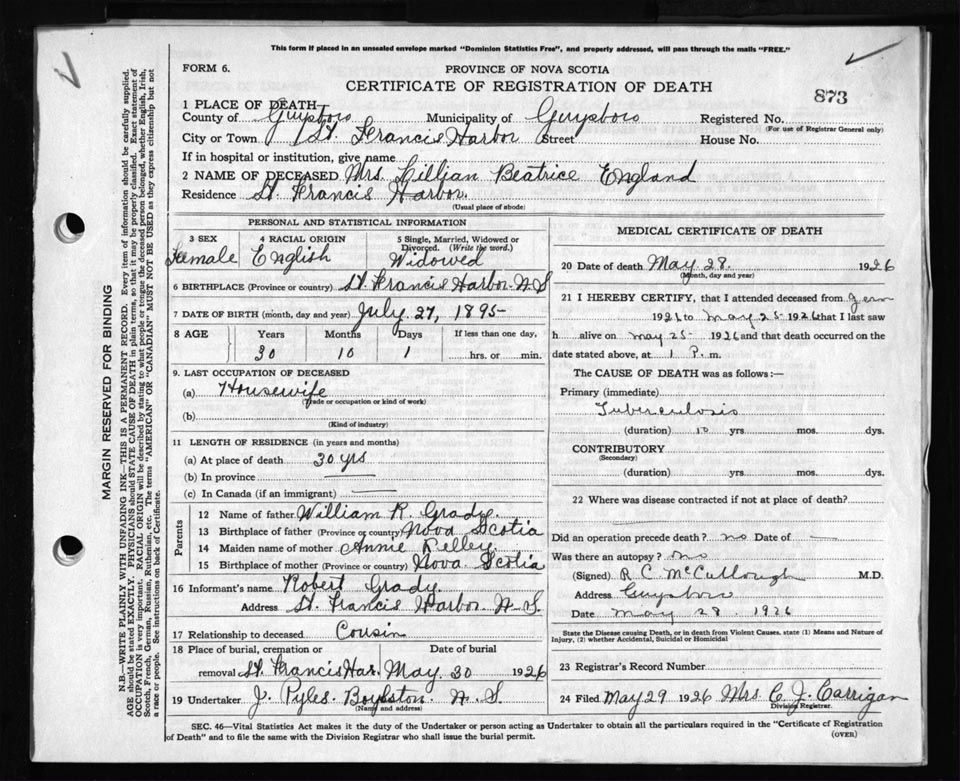 Female Death Registration: Year: 1926 file: 69 number: 873