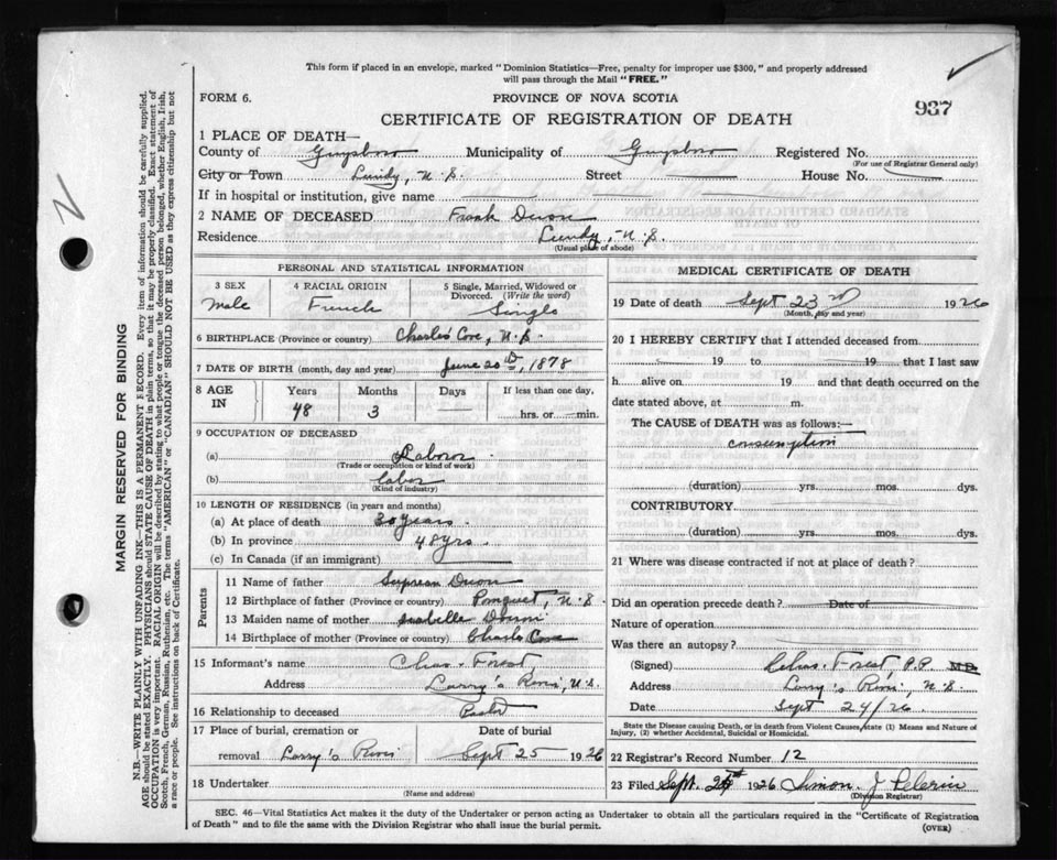 Male Death Registration: Year: 1926 file: 69 number: 937