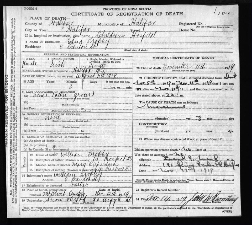 Death Registration: Year: 1919 file: 70 number: 104