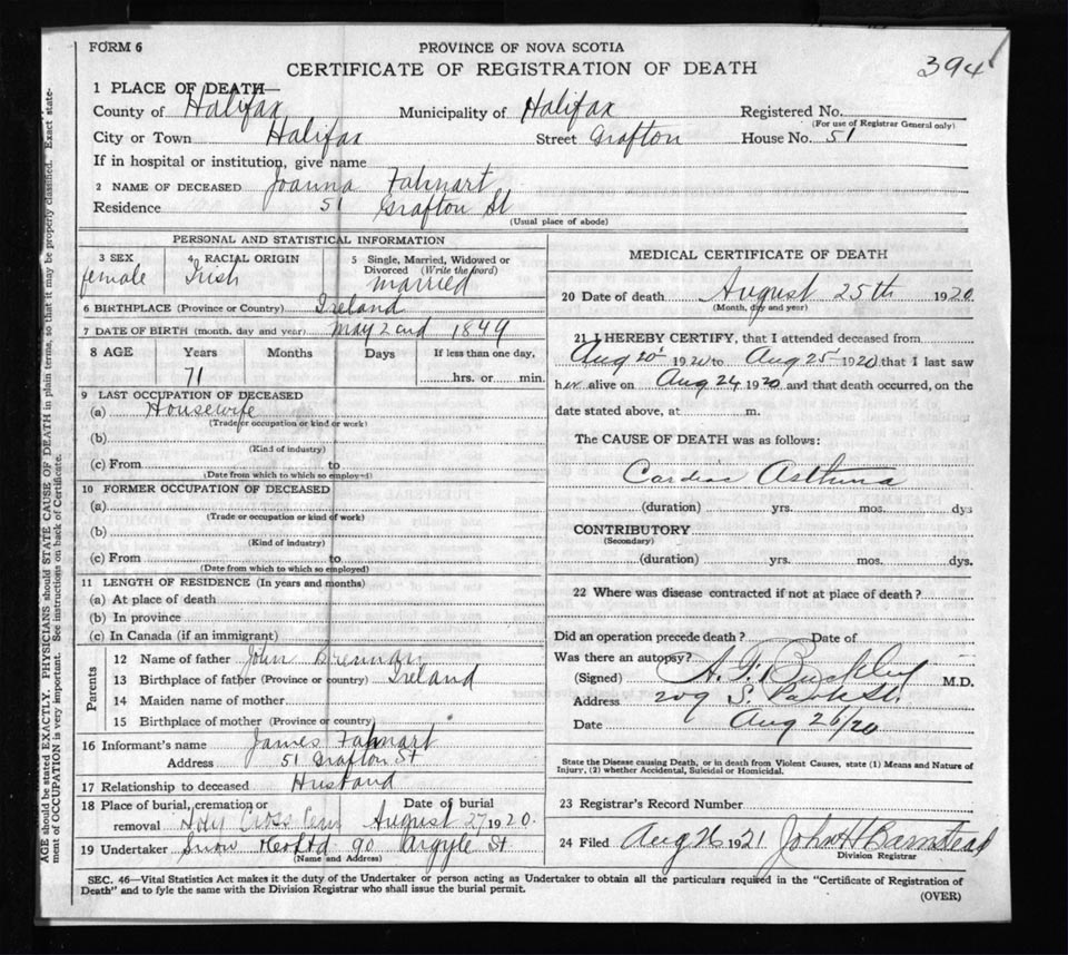 Death Registration: Year: 1920 file: 71 number: 394
