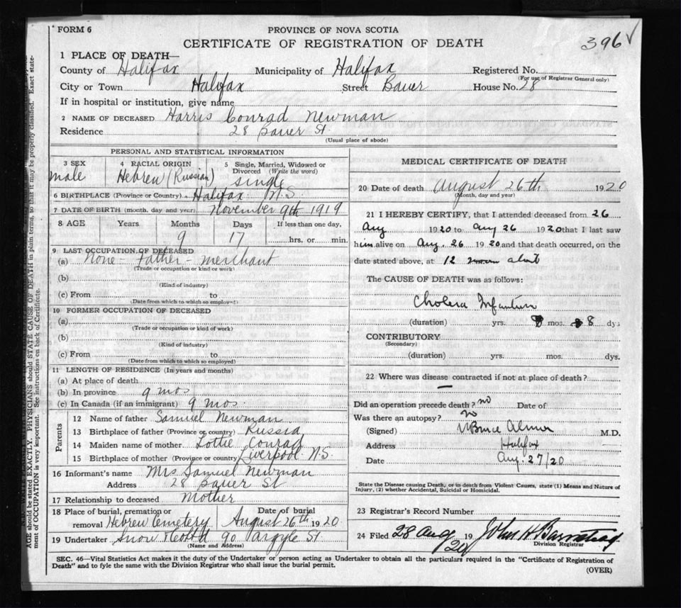 Death Registration: Year: 1920 file: 71 number: 396