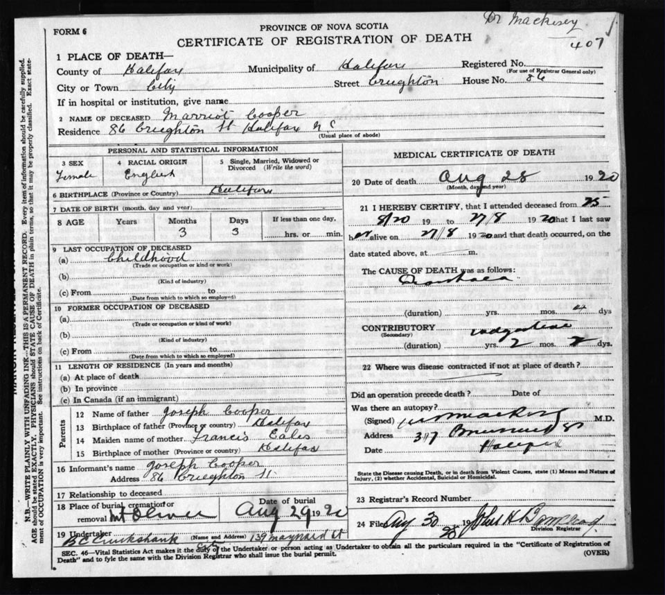 Death Registration: Year: 1920 file: 71 number: 407