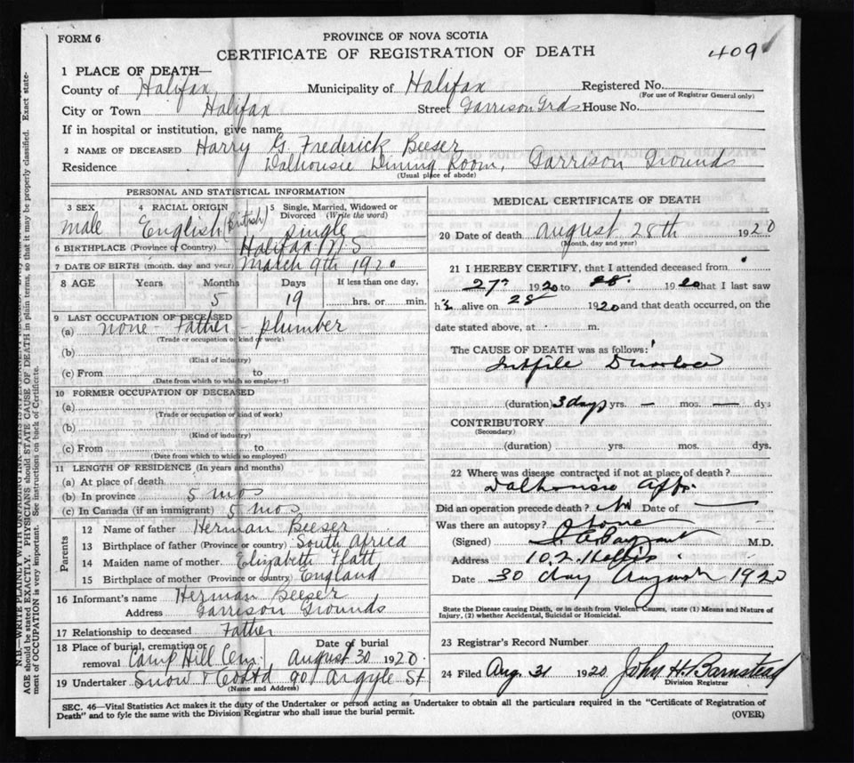 Death Registration: Year: 1920 file: 71 number: 409