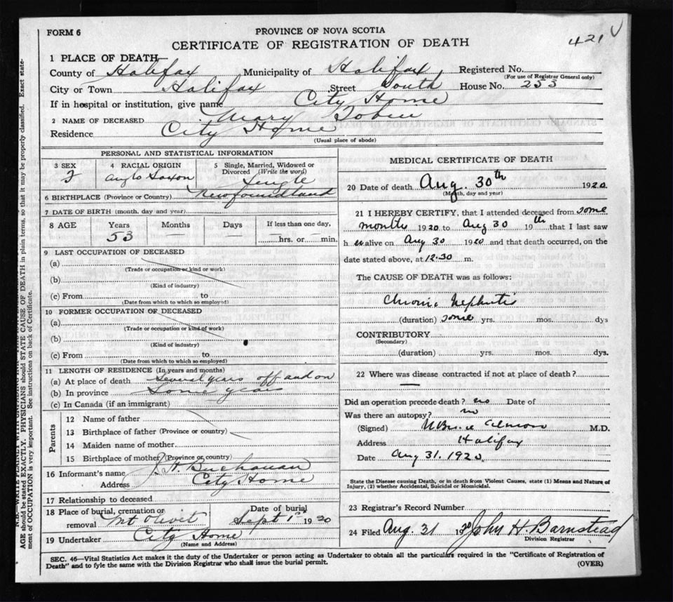 Death Registration: Year: 1920 file: 71 number: 421