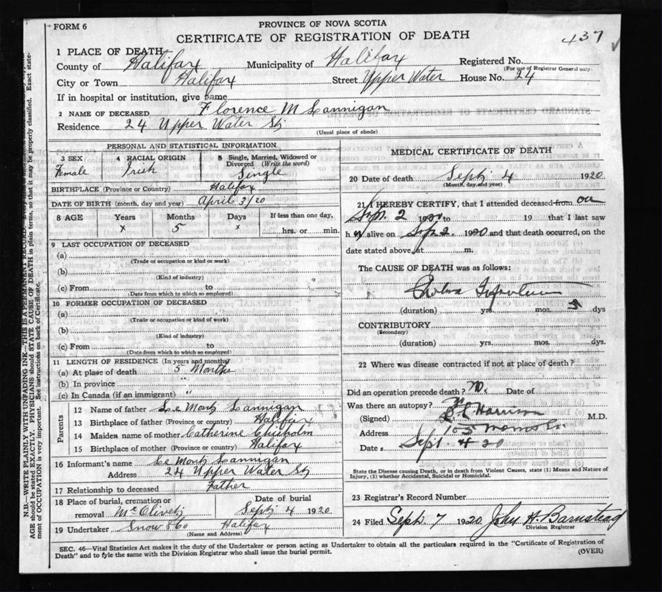 Death Registration: Year: 1920 file: 71 number: 437