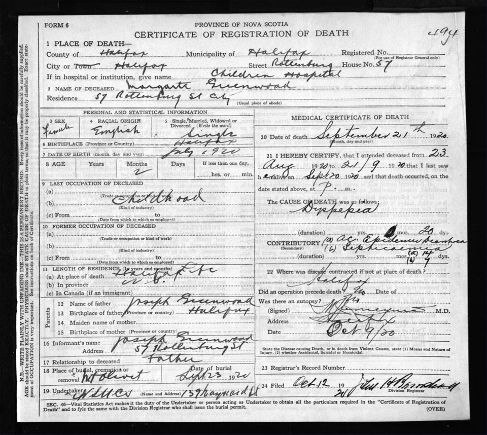 Death Registration: Year: 1920 file: 71 number: 494