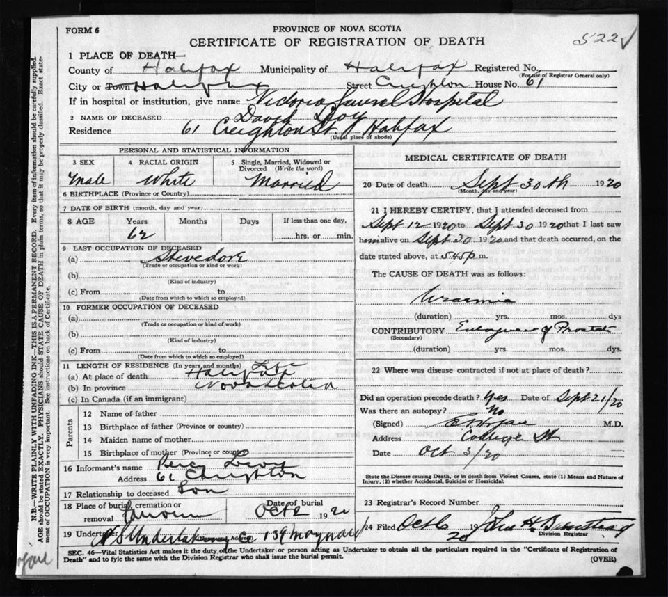 Death Registration: Year: 1920 file: 71 number: 522
