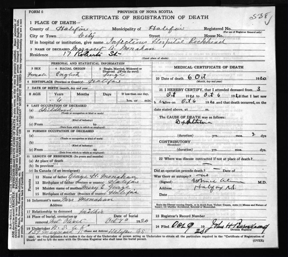 Death Registration: Year: 1920 file: 71 number: 538
