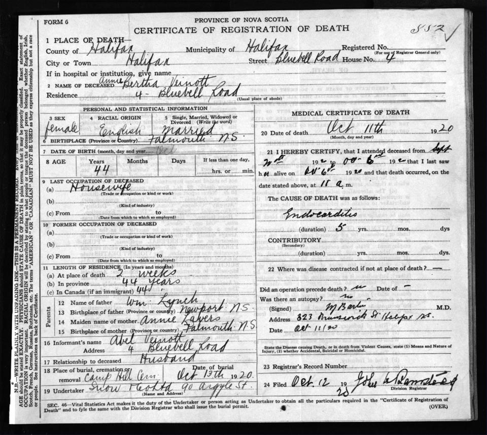 Death Registration: Year: 1920 file: 71 number: 552
